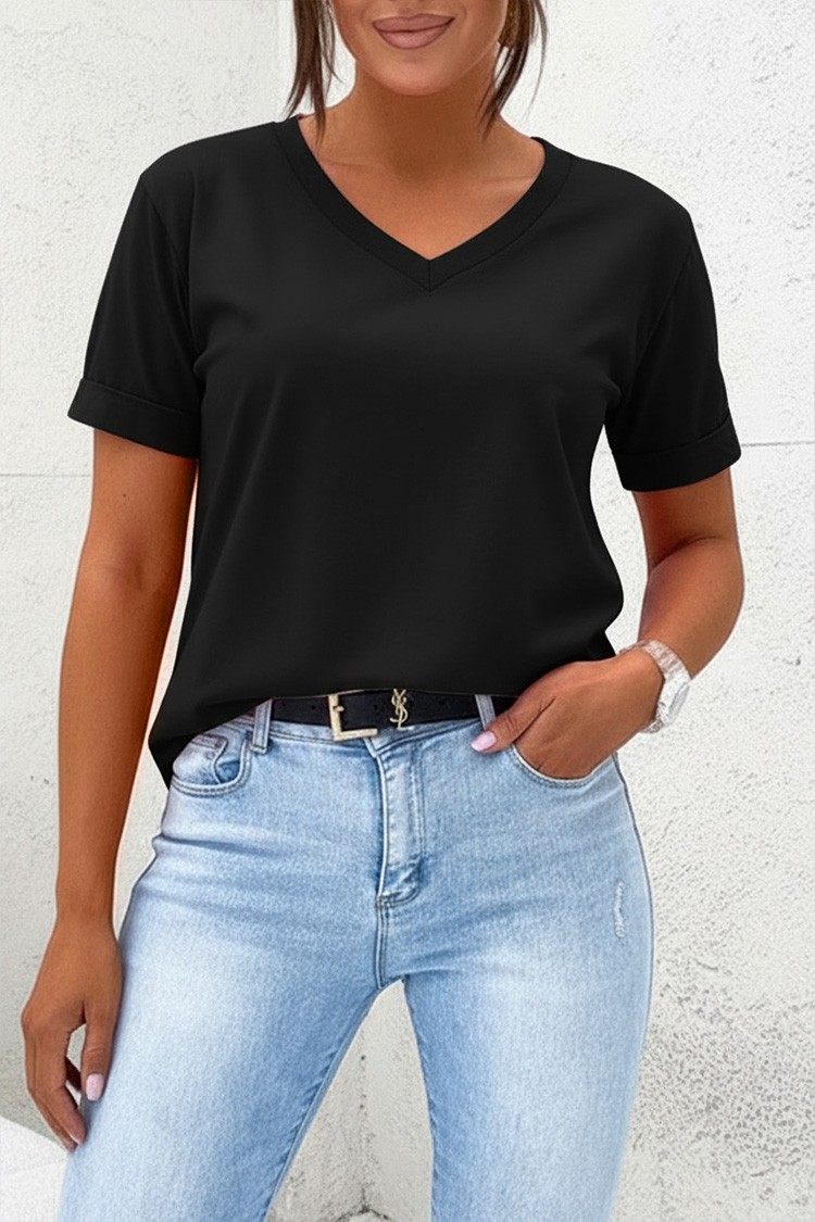 - A modell rövid ujjú, V-nyakú, klasszikus dizájnú és fekete színű.