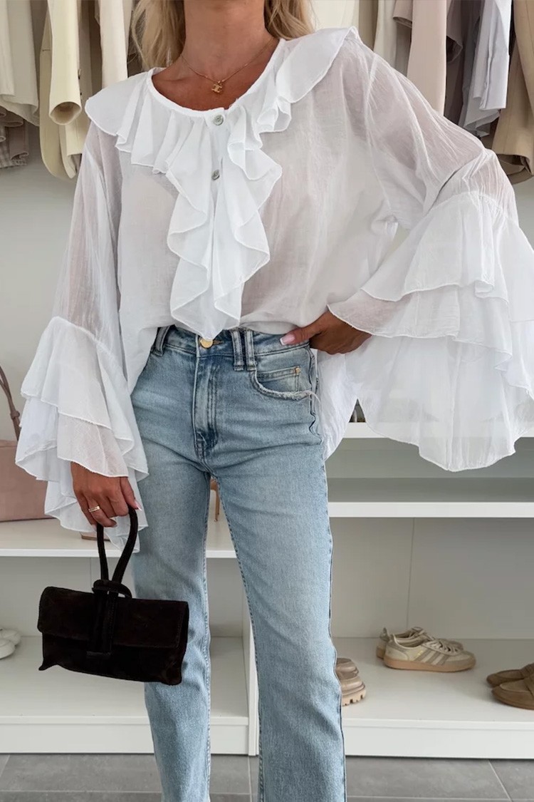 - A modell laza szabású, gombos, vonzó dizájnnal, teljes hosszában fodros.