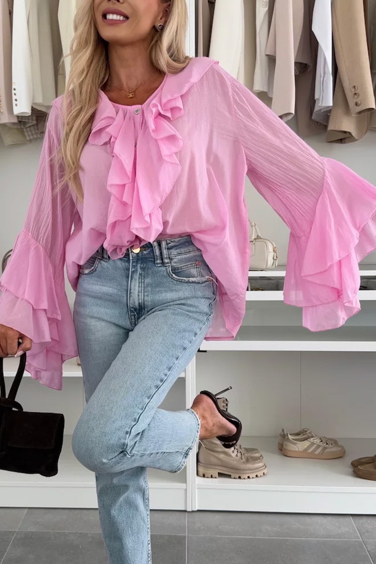 - A modell laza szabású, gombos, vonzó dizájnnal, teljes hosszában fodros.