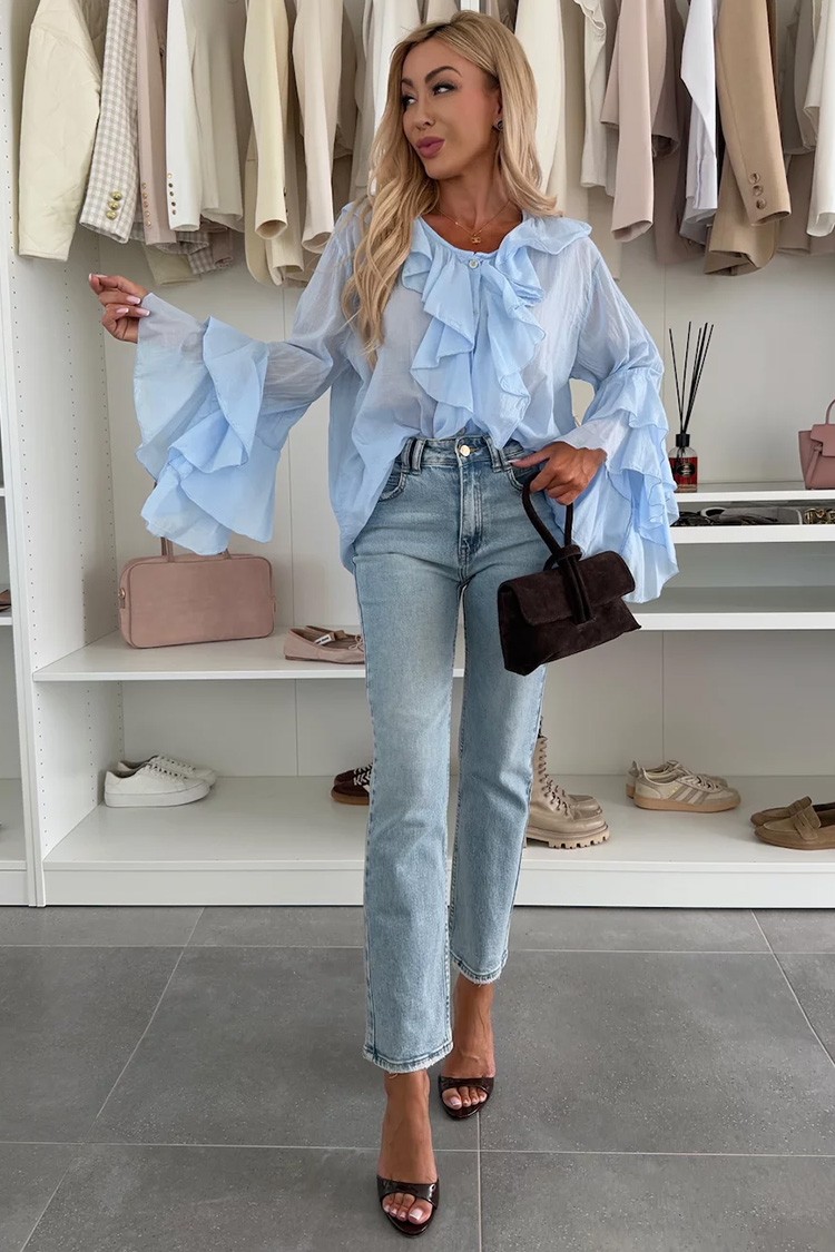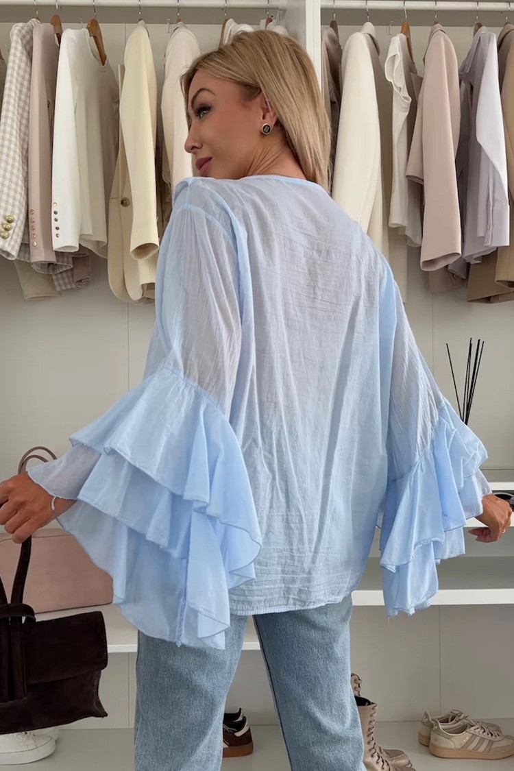 - A modell laza szabású, gombos, vonzó dizájnnal, teljes hosszában fodros.