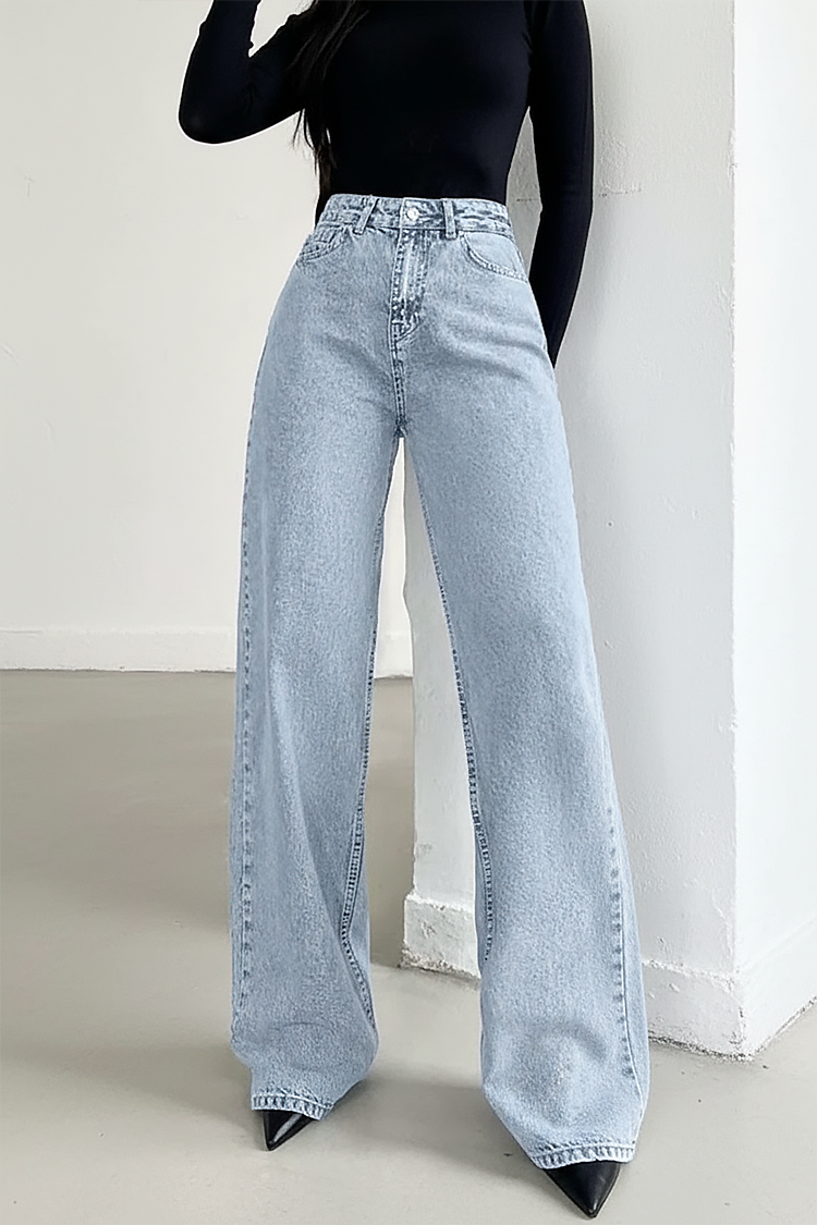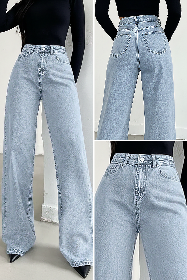 - A modell magas derekú és bő szabású, oldalsó zsebekkel és világoskék színben.