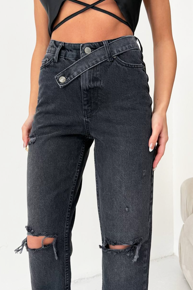 - A modell széles szárú, magas derekú, laza szabású, tépett hatású és aszimmetrikus rögzítésű.