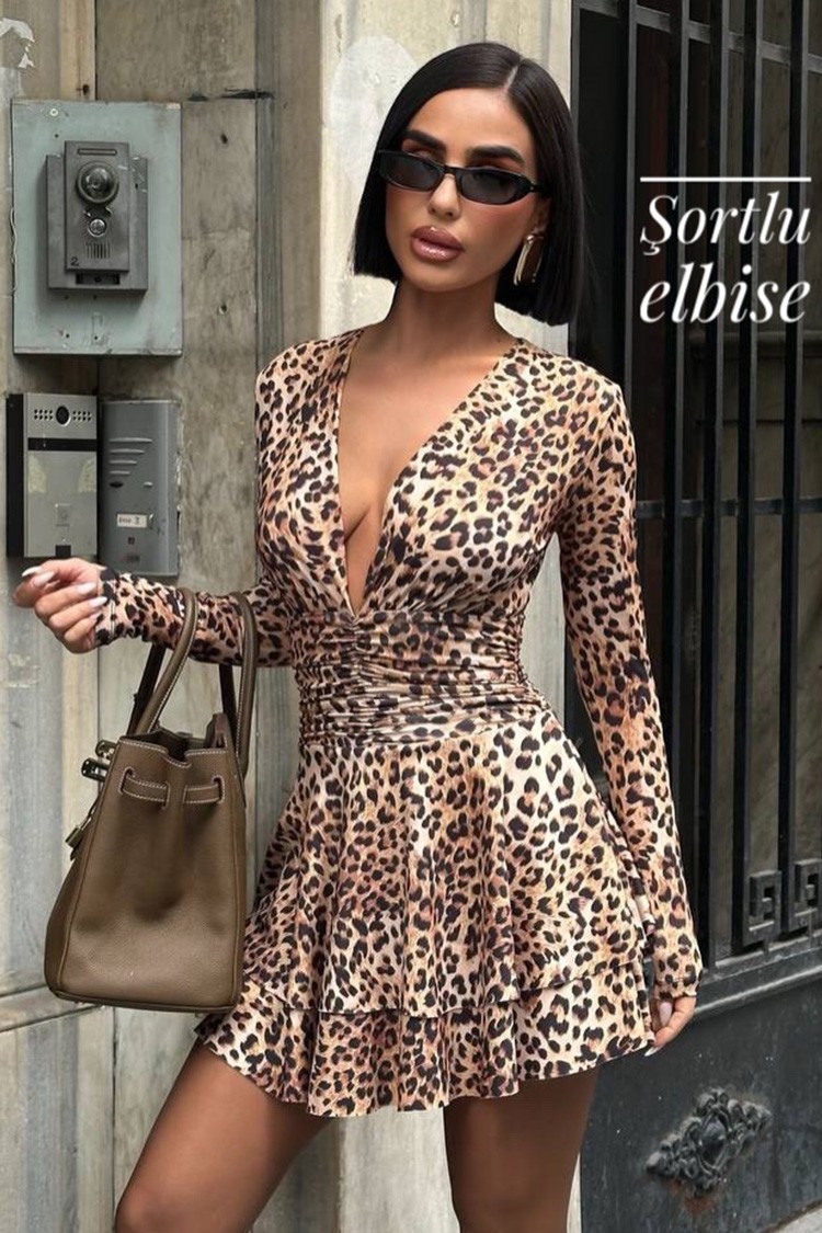 - A ruha vonzó szabású, leopárdmintás, hosszú ujjú, V dekoltázzsal.