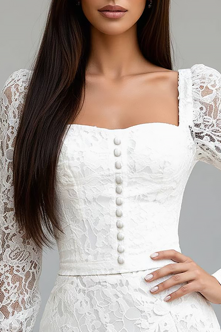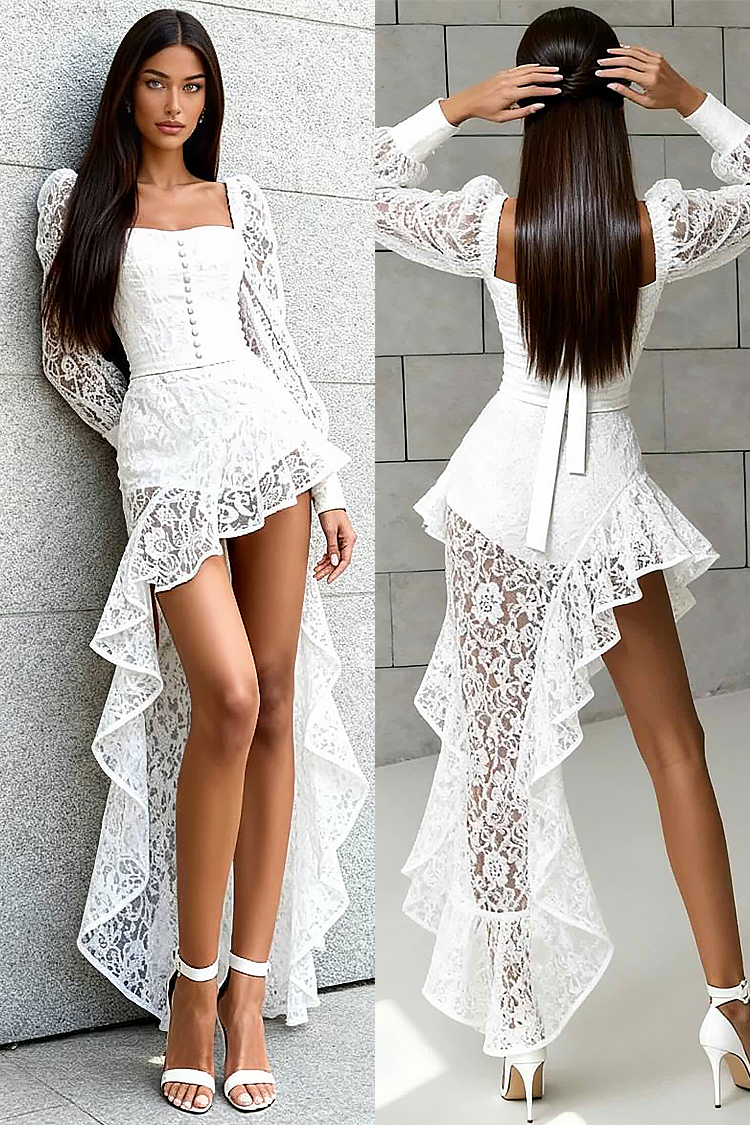 - A modell testhezálló szabással, aszimmetrikus szabással, szexi csipkével, hosszú ujjal és gombokkal rendelkezik.