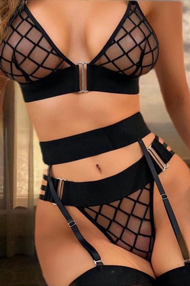 - Tartalmaz egy melltartót puha kosarakkal és vonzó hálóval, szexi tangát és harisnyatartót.