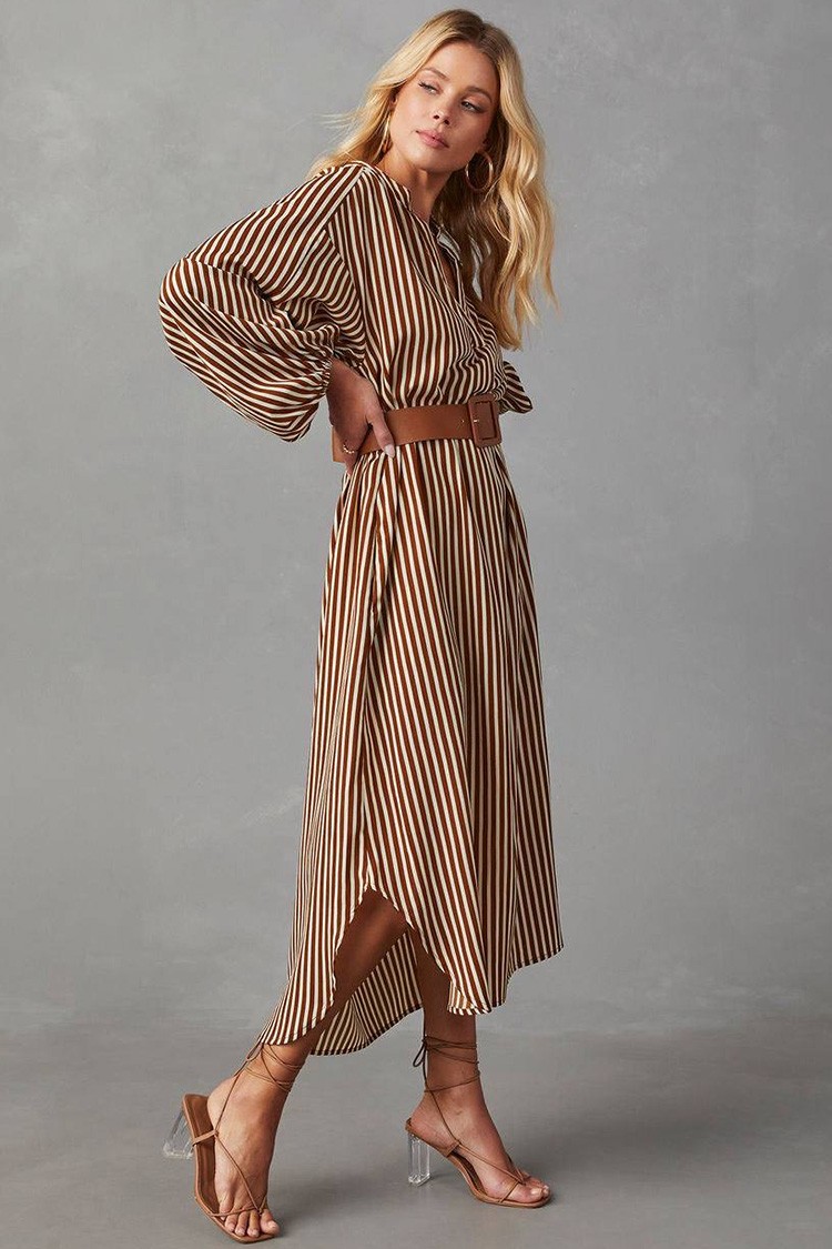 - Ha stílusosnak szeretnél lenni, bízd magad erre a vonzó csíkos mintás midi ruhára.