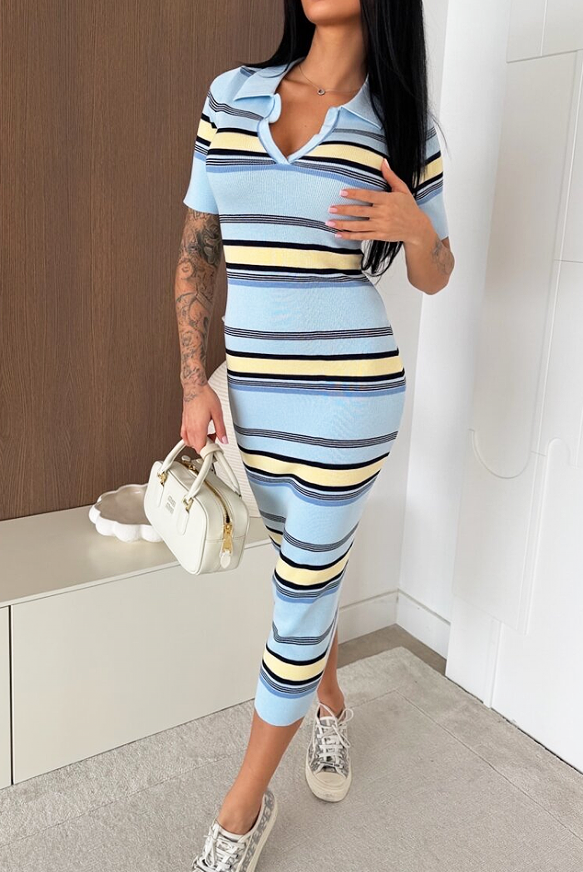 - A ruha szexi fazonú, testhezálló szabású, gallérral és vonzó csíkos mintával rendelkezik.