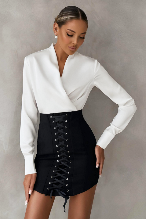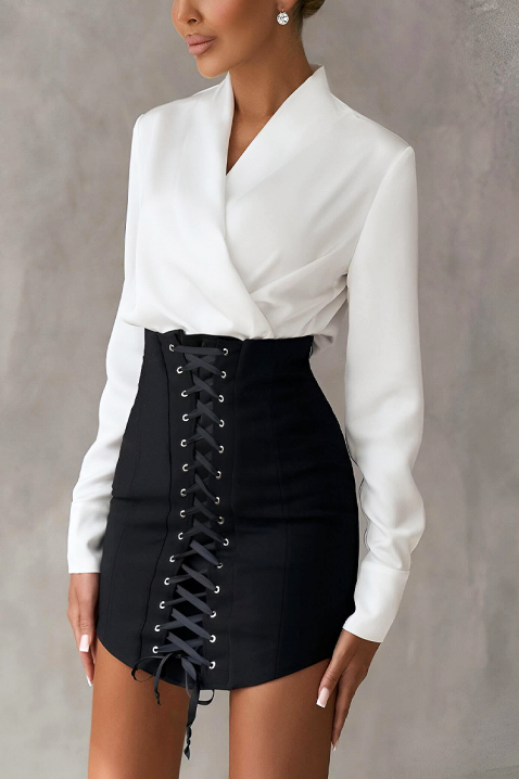 - A szoknya testhezálló, rövid fazonú, fekete színű és látványos megkötőkkel rendelkezik.