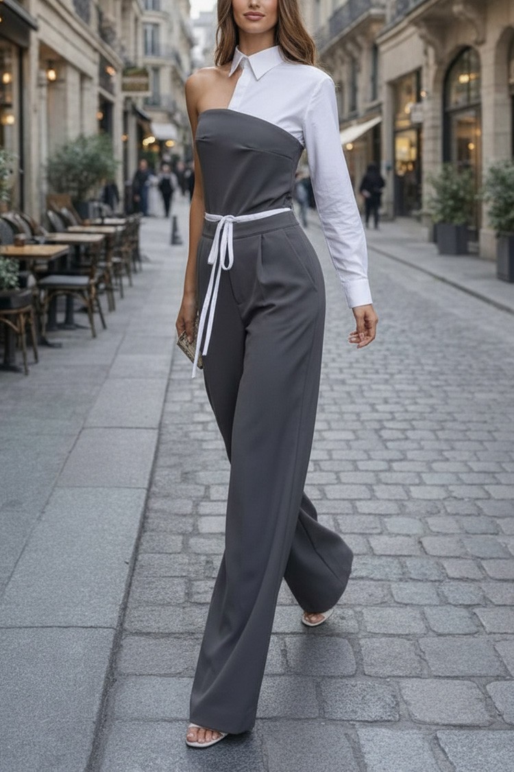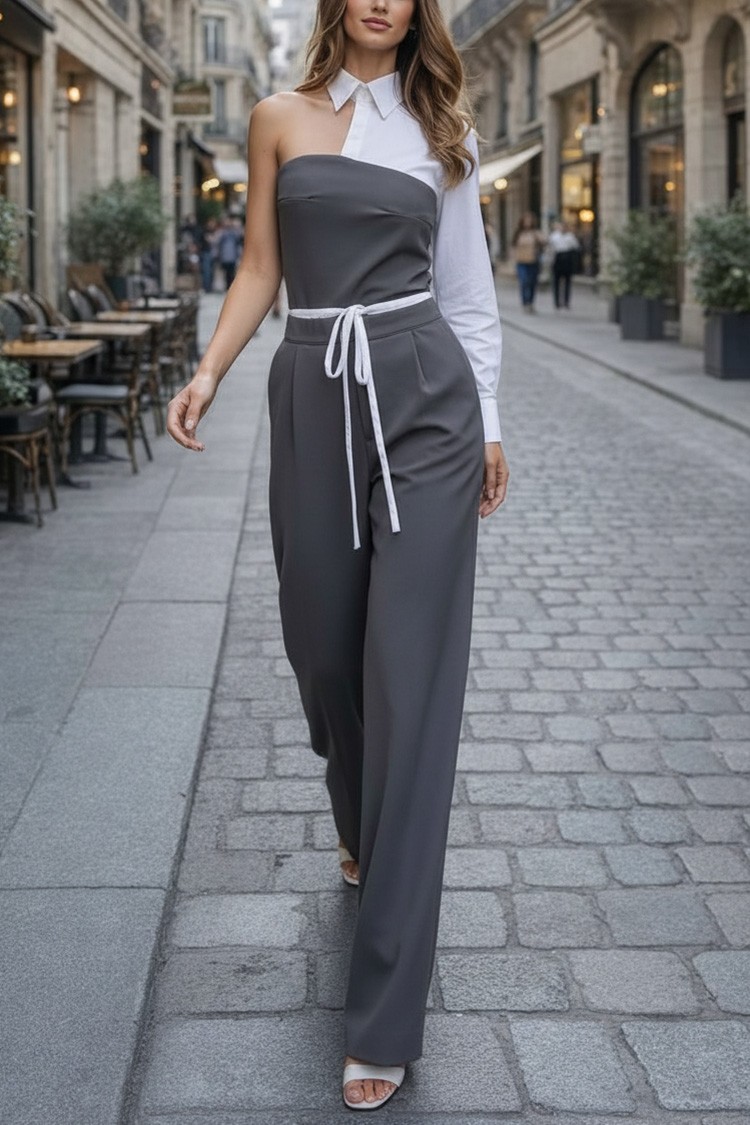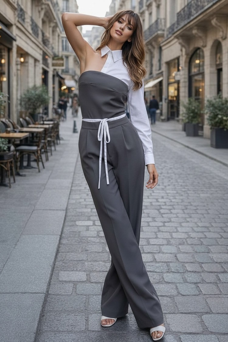 - A felső rész egy szexi felső aszimmetrikus szabással, gallérral és kombinált anyaggal.