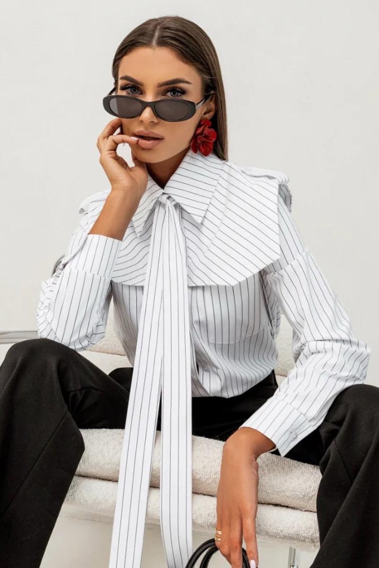- A modell hosszú ujjú, látványos csíkokkal és nyakkendővel rendelkezik.