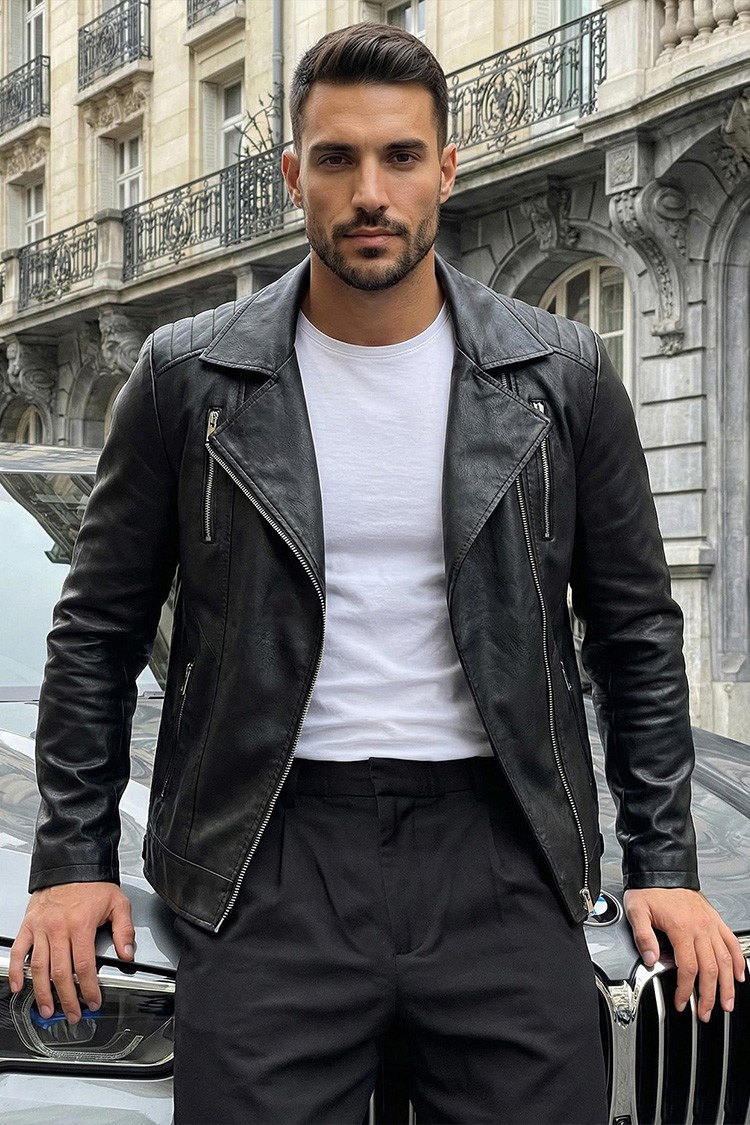 - Klasszikus fazonú férfi dzseki cipzárral, gallérral és oldalsó zsebekkel.
