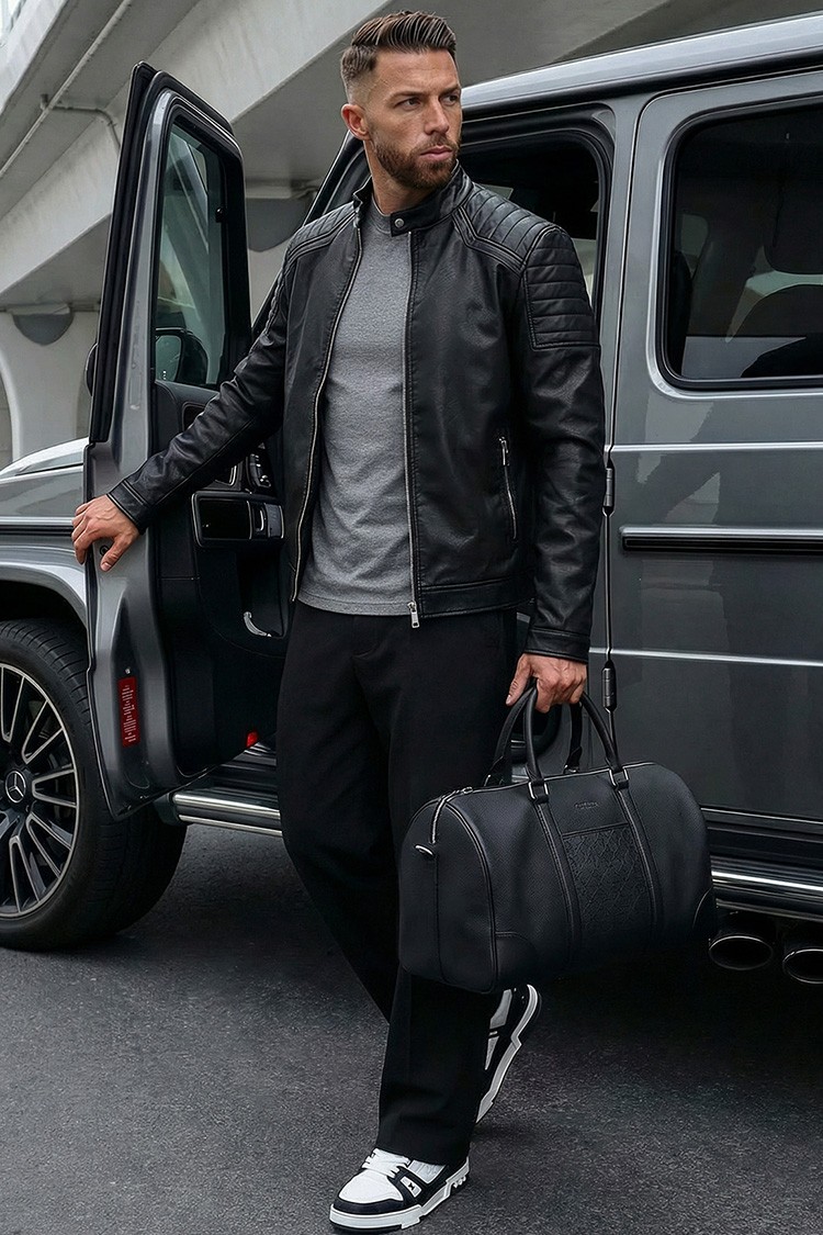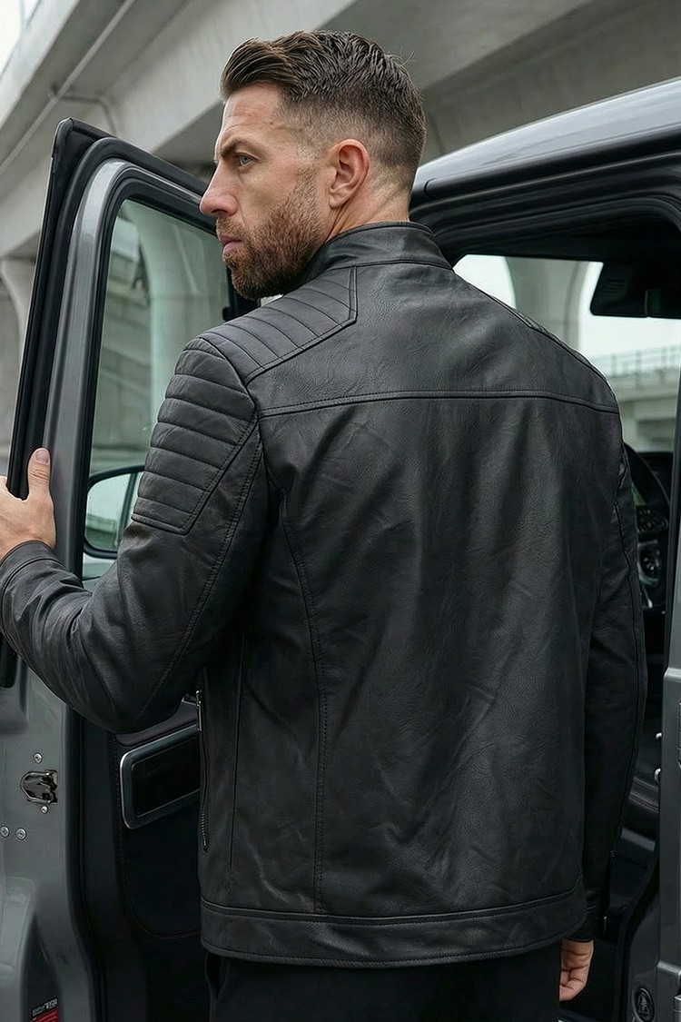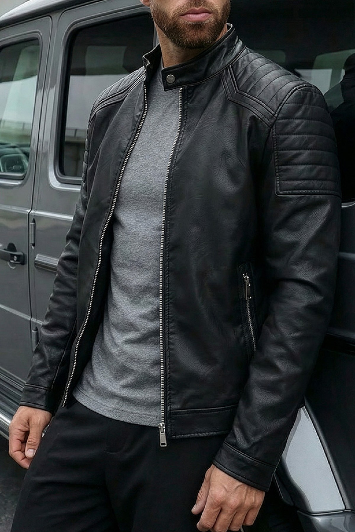 - Klasszikus fazonú férfi dzseki cipzárral, gallérral és oldalsó zsebekkel.