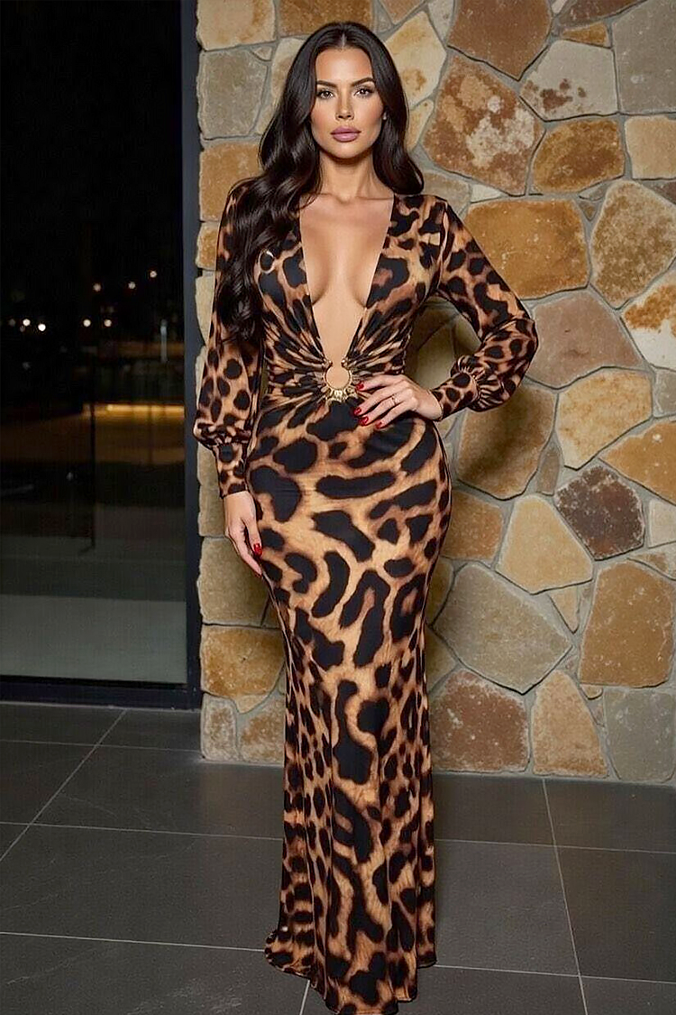 - A modell testhezálló szabású, hosszú ujjú, leopárdmintás és mély V dekoltázsú.