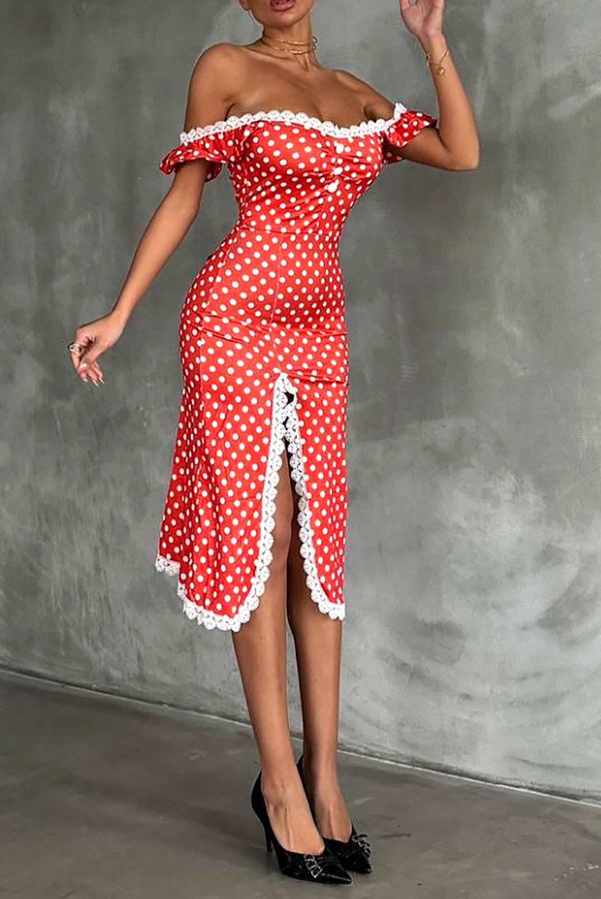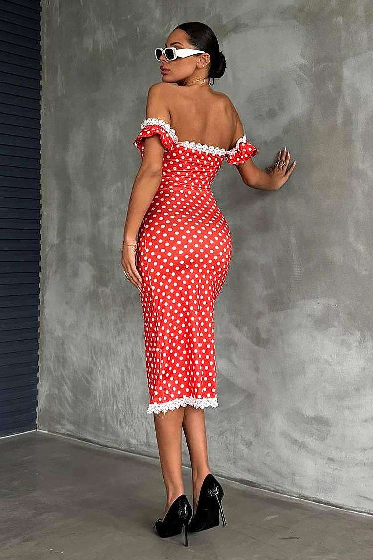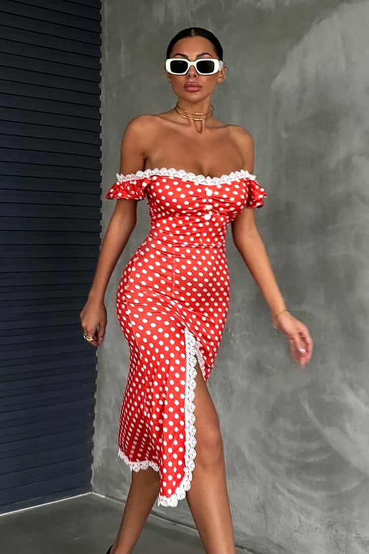 - A modell testhez simuló szabással, ejtett vállal, szexi hasítékkal és pöttyös mintával rendelkezik.