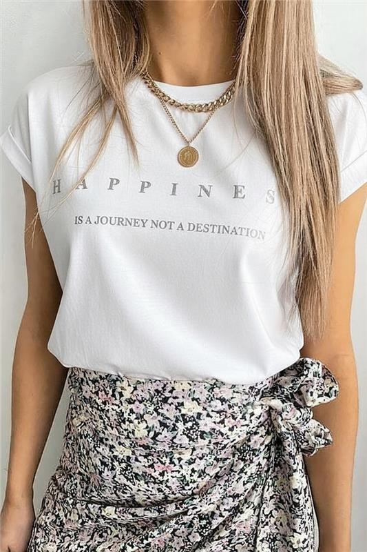 - A modell rövid ujjú, kerek nyakkivágású, precíz szabású, mutatós felirattal rendelkezik.