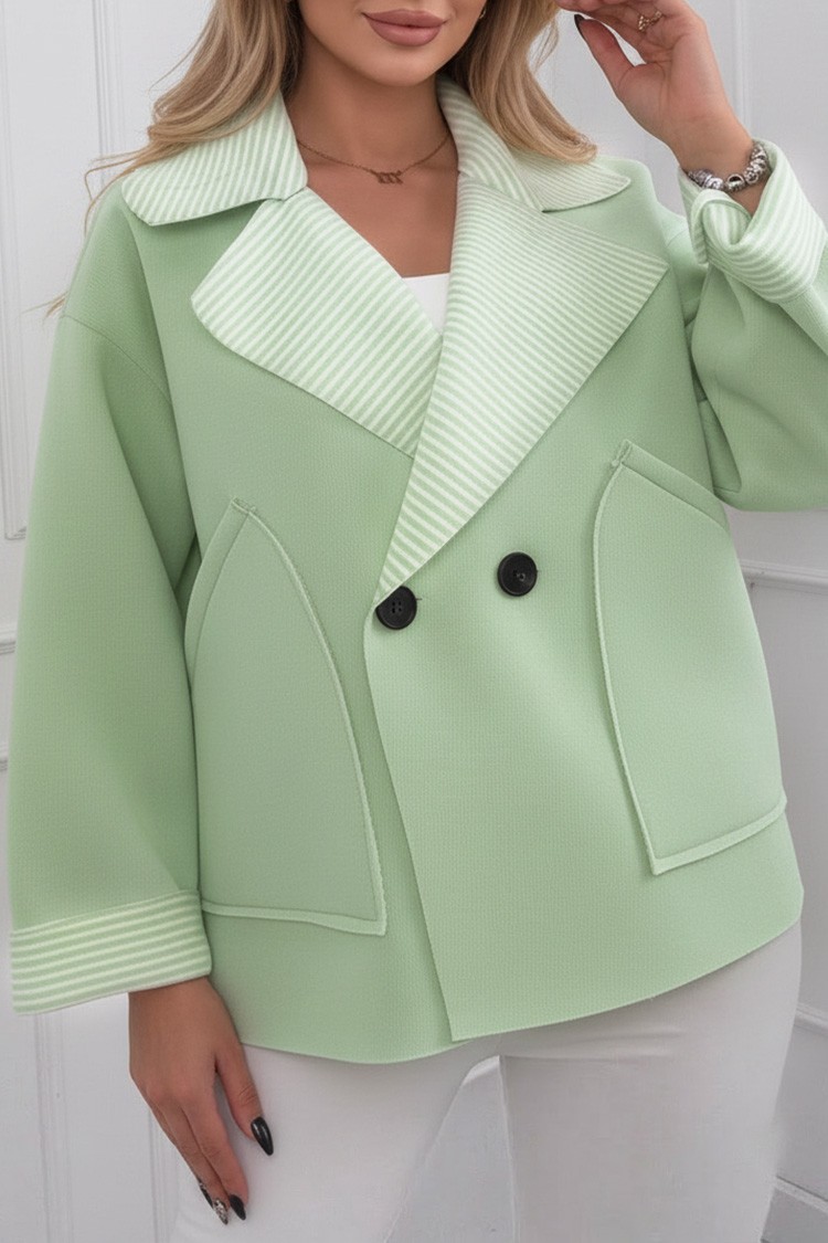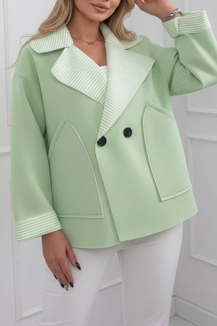 - A modell rövid szabású, oldalsó zsebekkel és elöl gombokkal rendelkezik.
