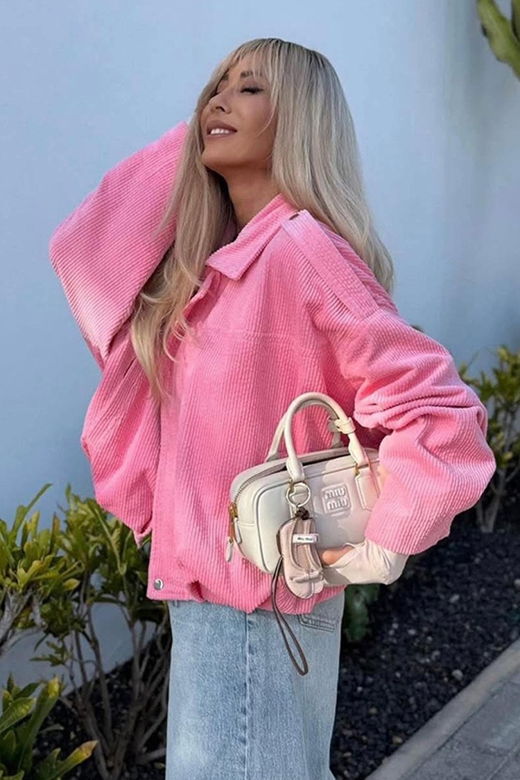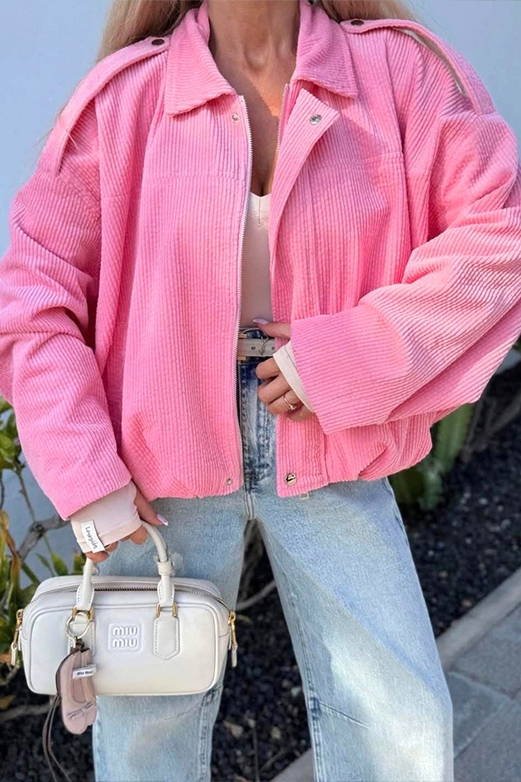 - A modell túlméretezett szabású, bordázott anyagú, mutatós rózsaszín színben, cipzárral és gombokkal rögzíthető.