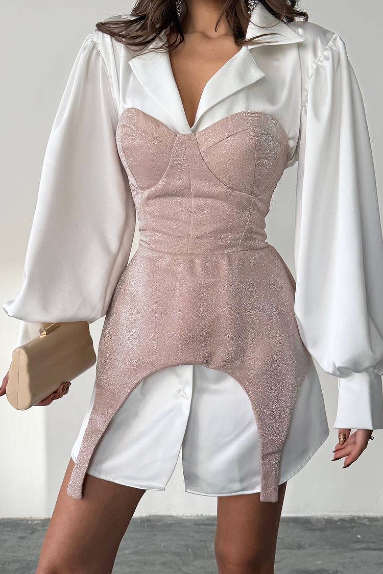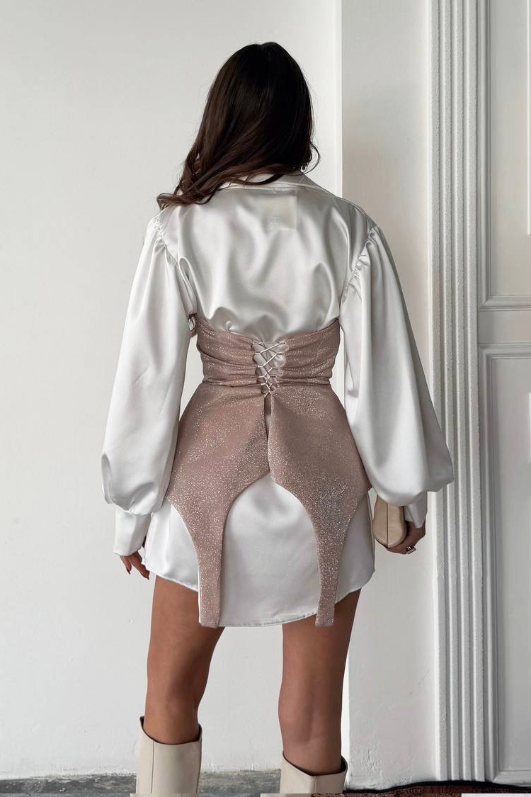 - A modell hosszú ujjú, elegáns szabású, fényes hatású fűzővel és hátul megkötővel rendelkezik.