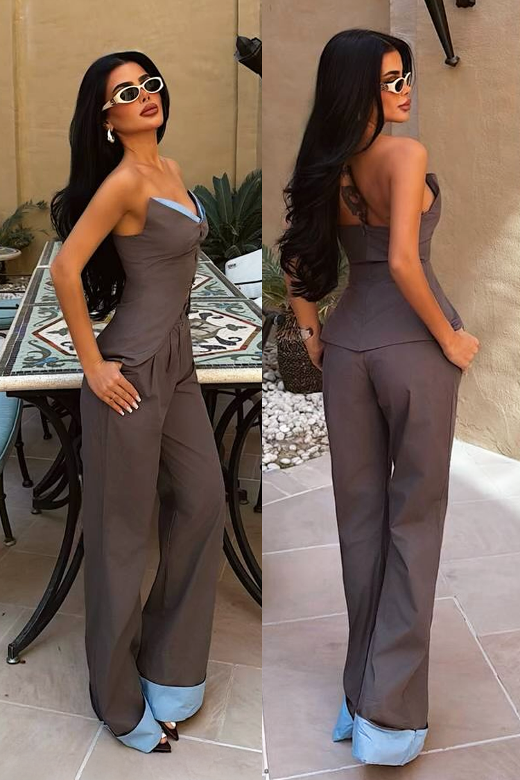 - A nadrág magas derekú, széles szárú, látványos szegéllyel.