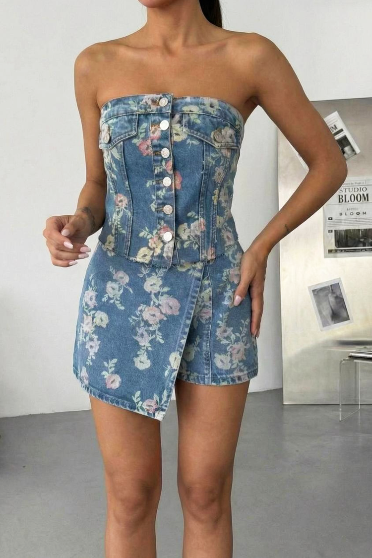 - Elegáns kétrészes szett: top és nadrág-szoknya látványos virágmintával.