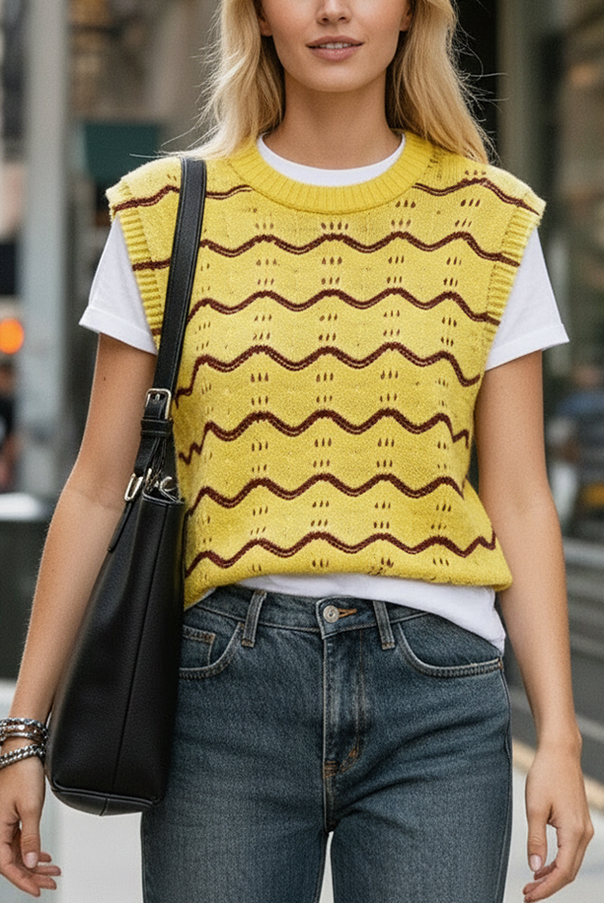 - Látványos pulóver (mellény) divatos dizájnnal, amely alkalmas mindennapi megjelenésre.