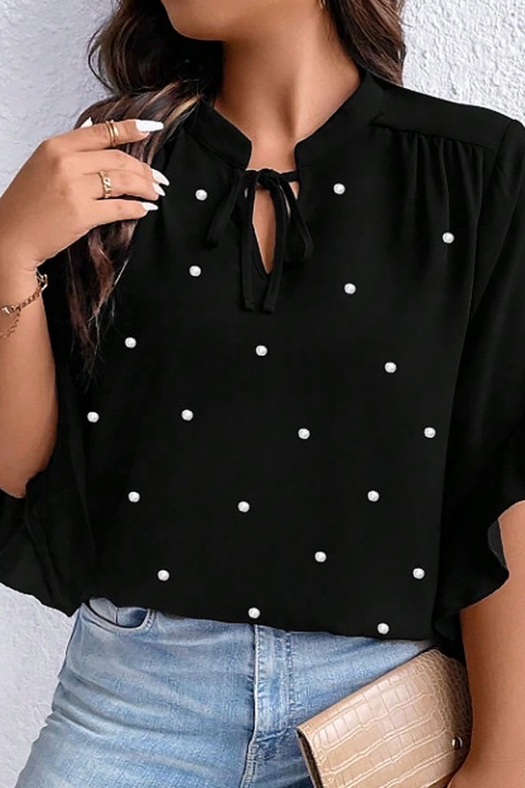 - A modell kényelmes szabással, rövid ujjal, pöttyös mintával és megkötős nyakkivágással rendelkezik.