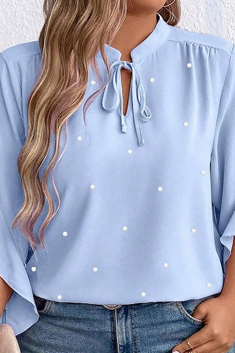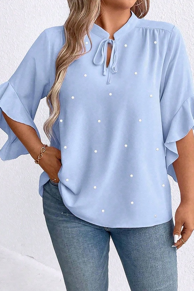 - A modell kényelmes szabással, rövid ujjal, pöttyös mintával és megkötős nyakkivágással rendelkezik.
