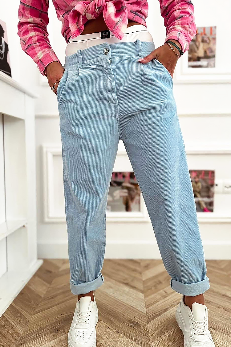 - A modell magas derekú, egyenes szabású, a szárán pedig praktikus zsebekkel ellátott szegély található.