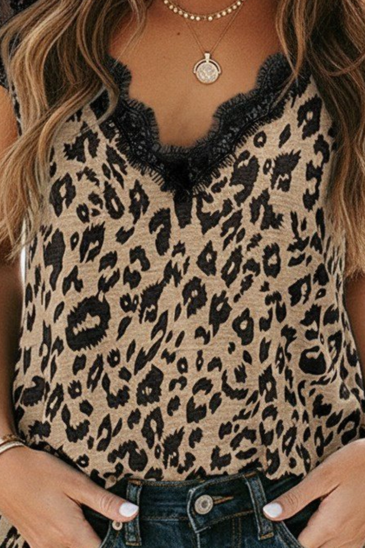 - A modell bő szabású, leopárdmintás és csipkés V-nyakkal rendelkezik.