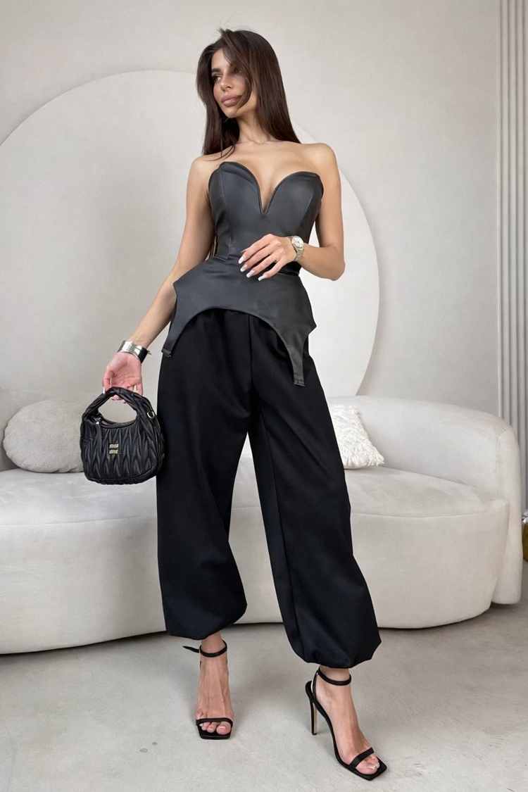 - A felső testhezálló szabással, szexi dekoltázzsal és látványos eko bőrből készült dizájnnal rendelkezik.