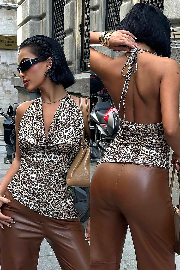 - A modell klasszikus szabású, szexi fazonú, mutatós nyitott háttal, leopárdmintával.