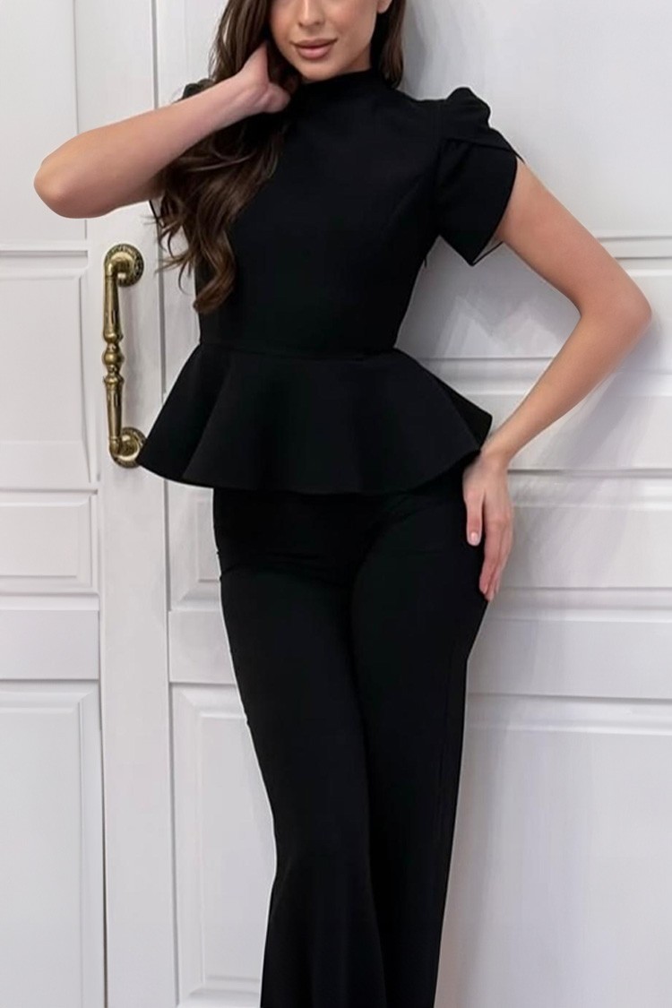 - A modell látványos szabással, rövid ujjal, fekete színnel és mutatós hátrésszel rendelkezik, gombokkal és szalaggal.