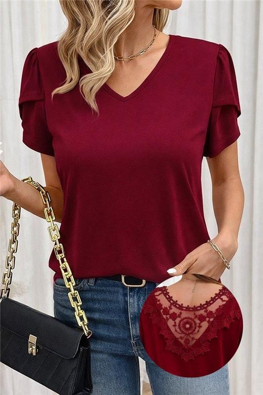 - A modell klasszikus szabású, rövid ujjú és látványos csipke díszítésű a háton.