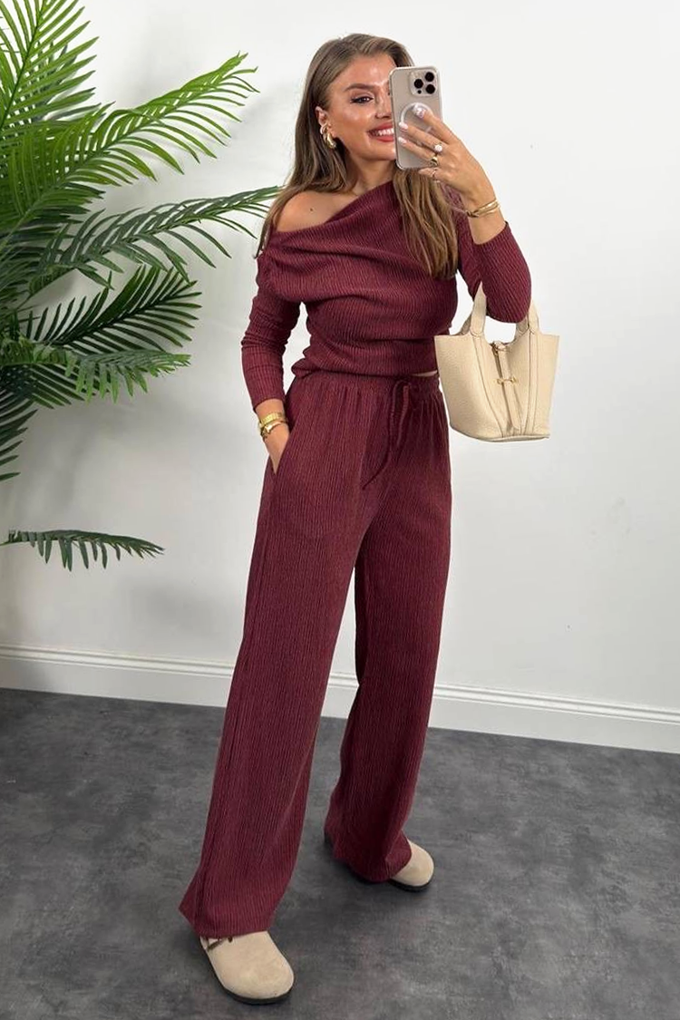 - A felső klasszikus szabású és ejtett vállal, a nadrág pedig laza fazonú és magas derekú.