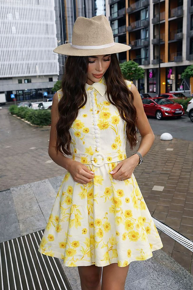 - A modell rövid fazonú, gallérral, gombokkal, virágmintával és ugyanabból az anyagból készült övvel rendelkezik.