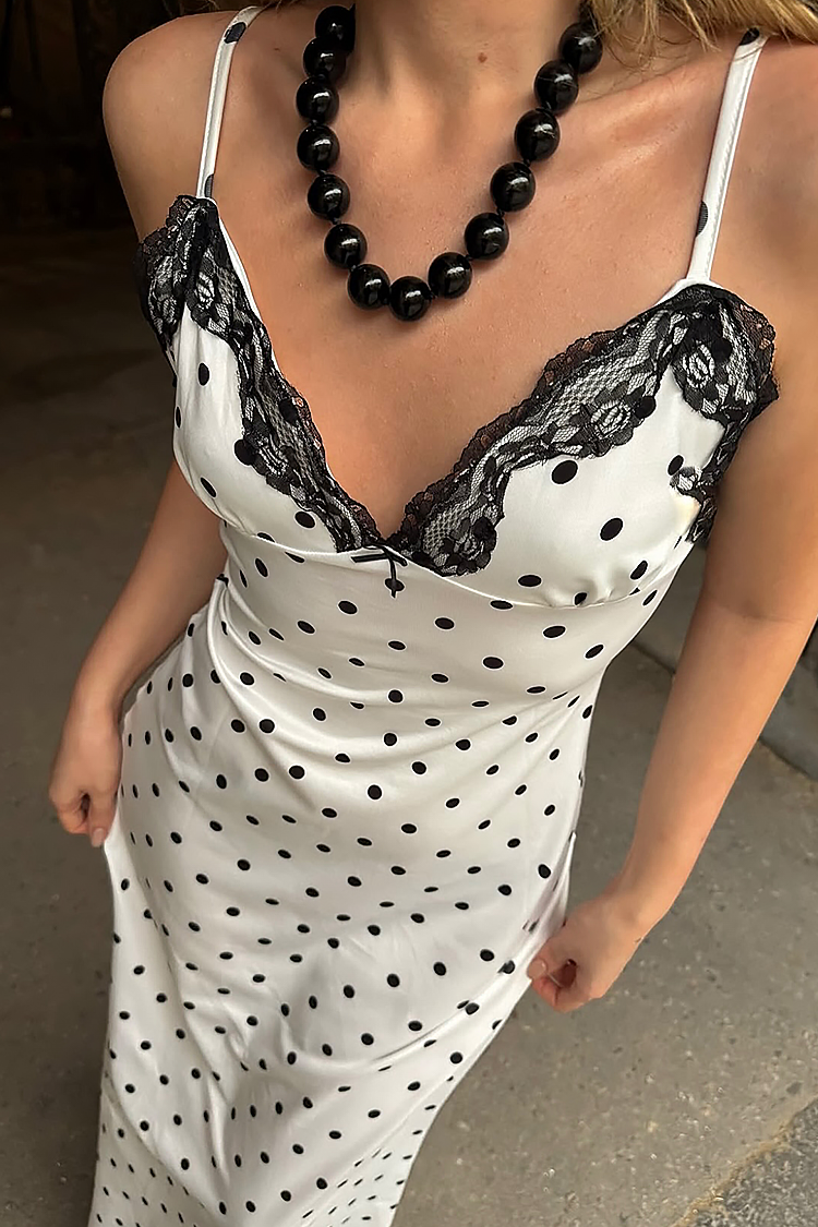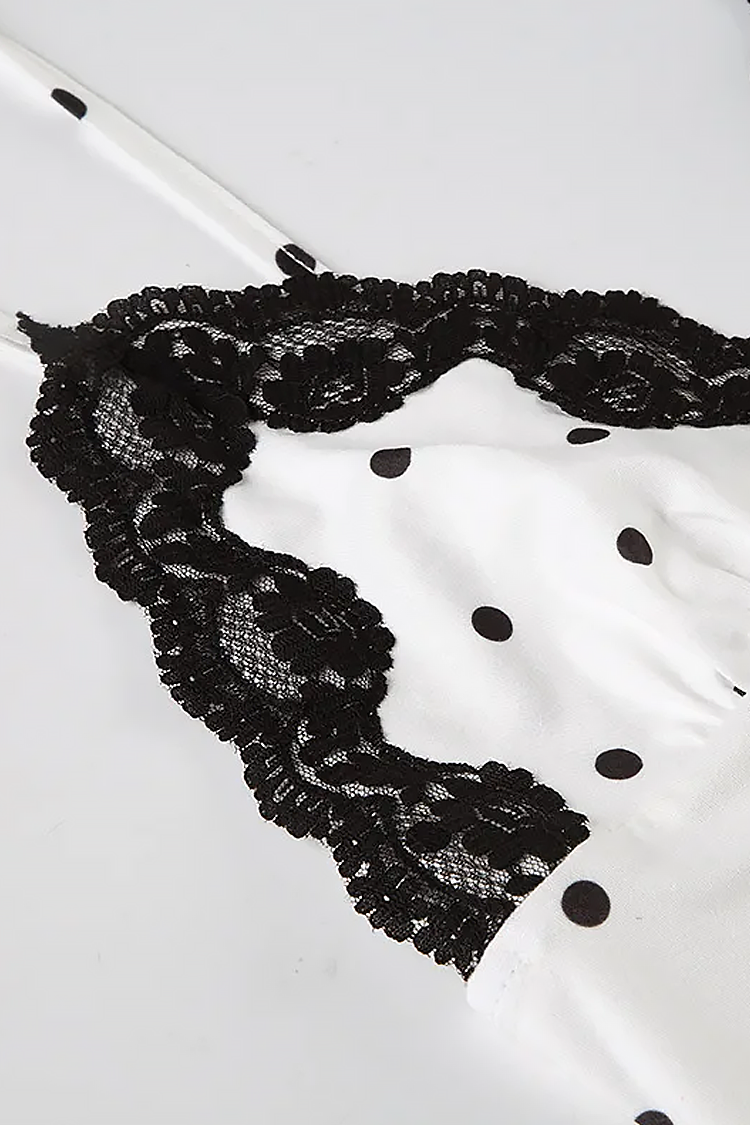 - A modell elegáns fazonnal, kontrasztos pöttyös mintával és szexi csipkés nyakkivágással rendelkezik.