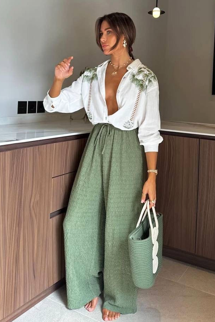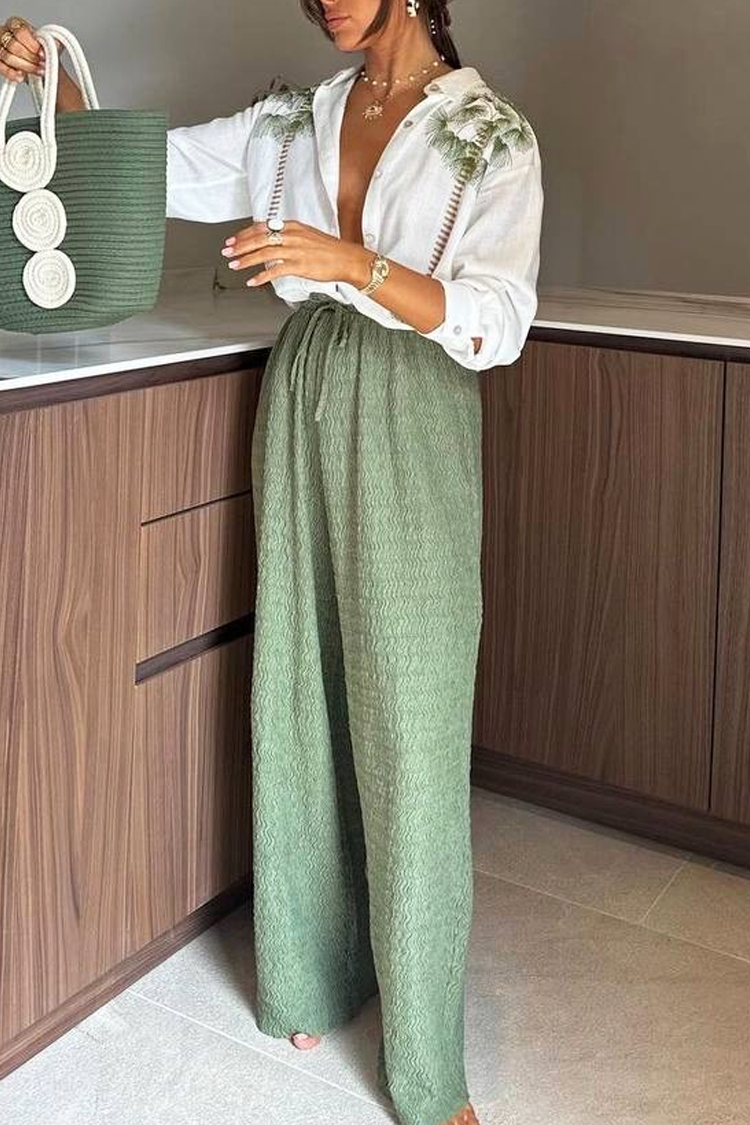 - Az ing fehér színben, gallérral, gombokkal és vonzó pálmafa mintával rendelkezik.