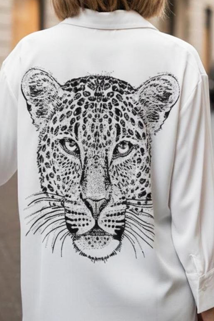 - A modell teljes hosszában gombokkal, gallérral, klasszikus dizájnnal és mindkét oldalán mintával rendelkezik.