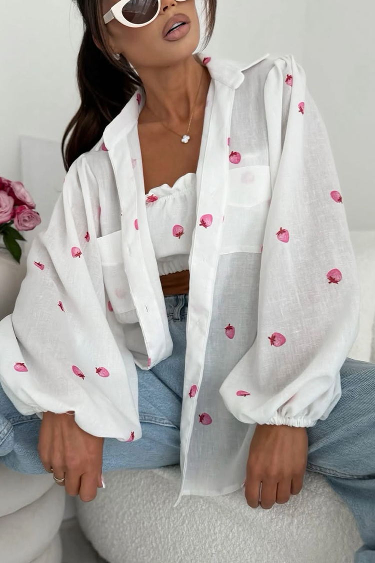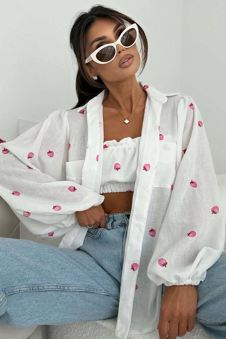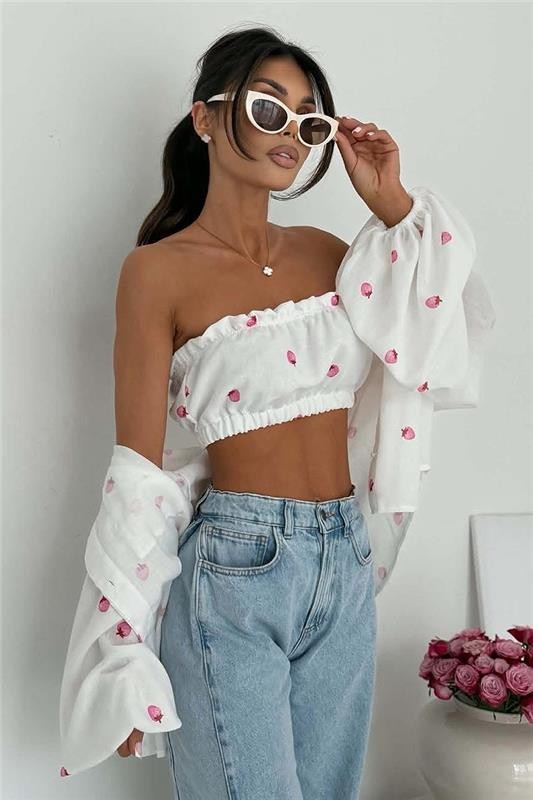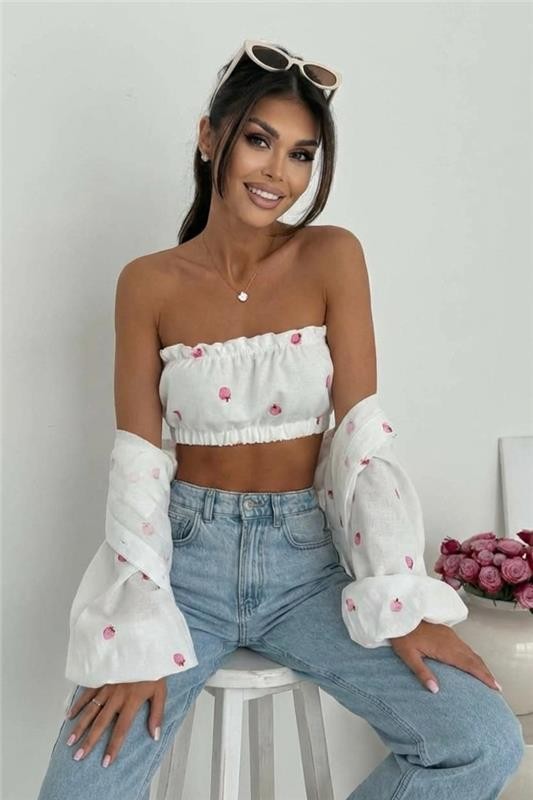 - Az ing hosszú ujjú, standard gombos záródású és epermintás, a felső pedig crop hosszúságú, nyitott vállal.