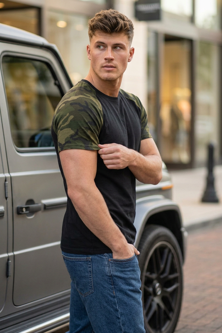 - Divatos férfi póló kényelmes szabással és nyomtatással az ujjakon, amely alkalmas mindennapi életre, szabadidőre vagy sportos megjelenés kiegészítéseként.