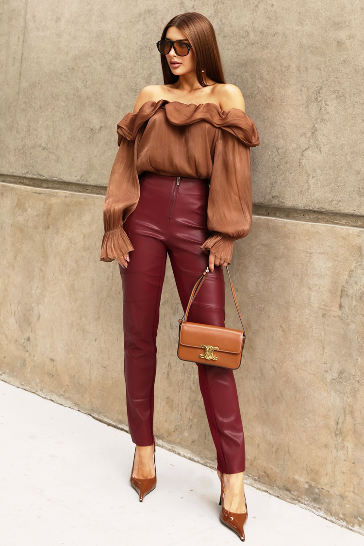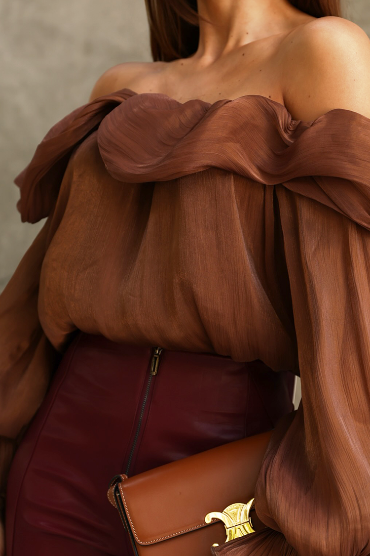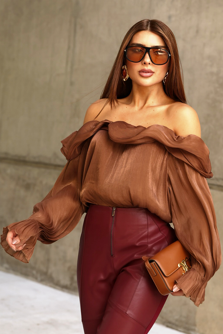 - A modell hosszú ujjú, csinos fazonú, ejtett vállal, világosbarna színben.