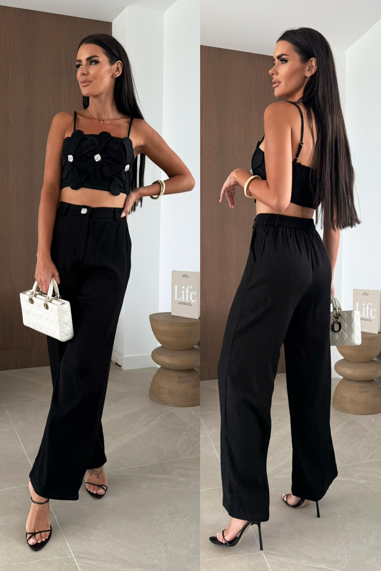 - A felső rész egy látványos virágokkal díszített crop top, az alsó rész pedig egyenes szabású nadrág.