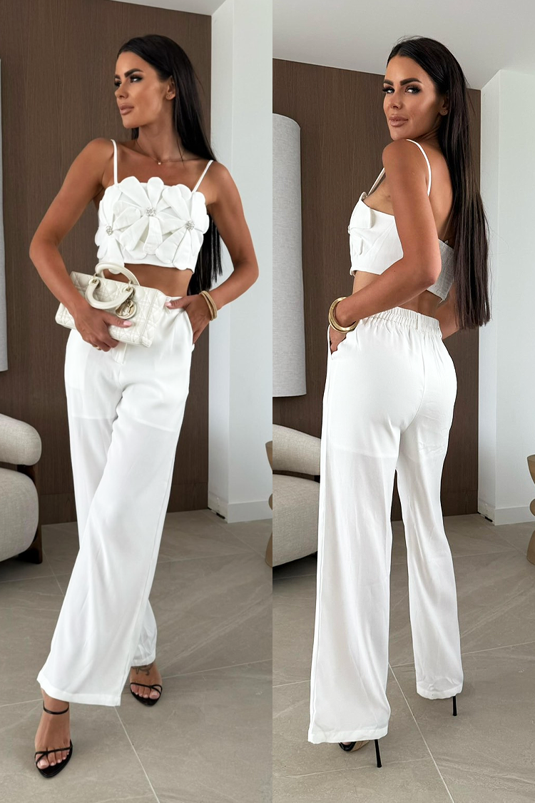 - A felső rész egy látványos virágokkal díszített crop top, az alsó rész pedig egyenes szabású nadrág.