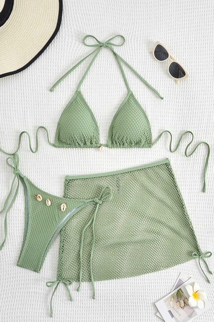 - Divatos strand szett, amely egy kétrészes fürdőruhát és egy szoknyát tartalmaz.