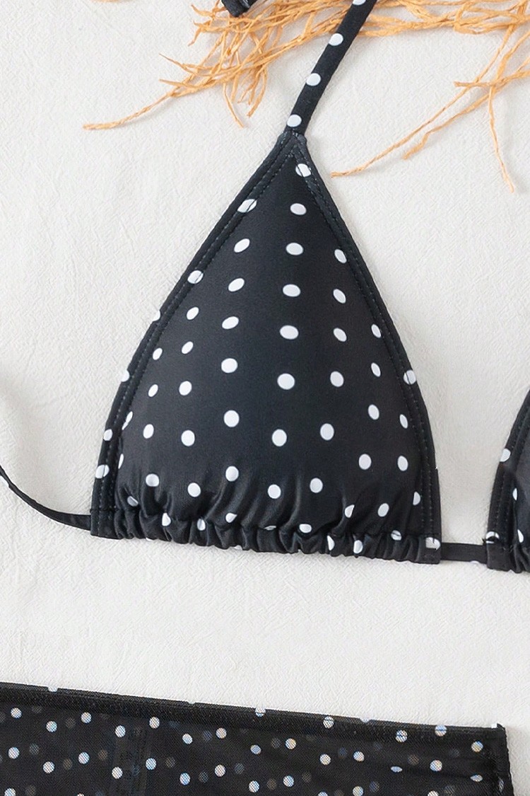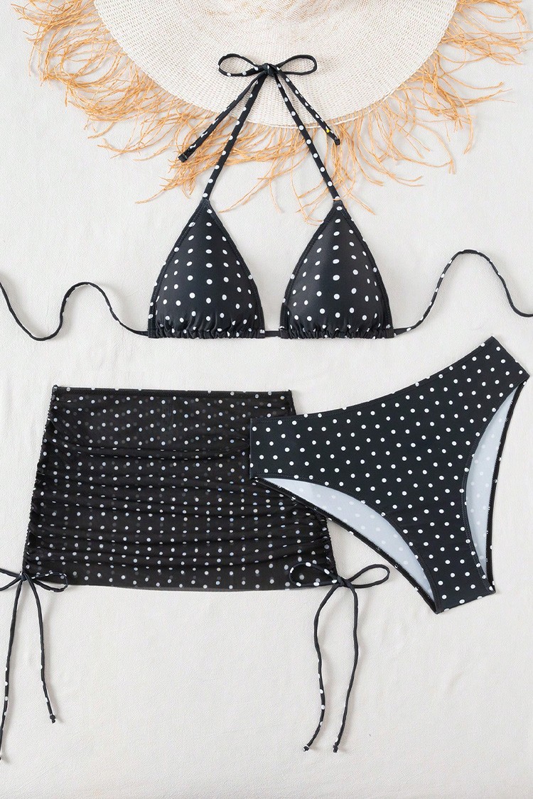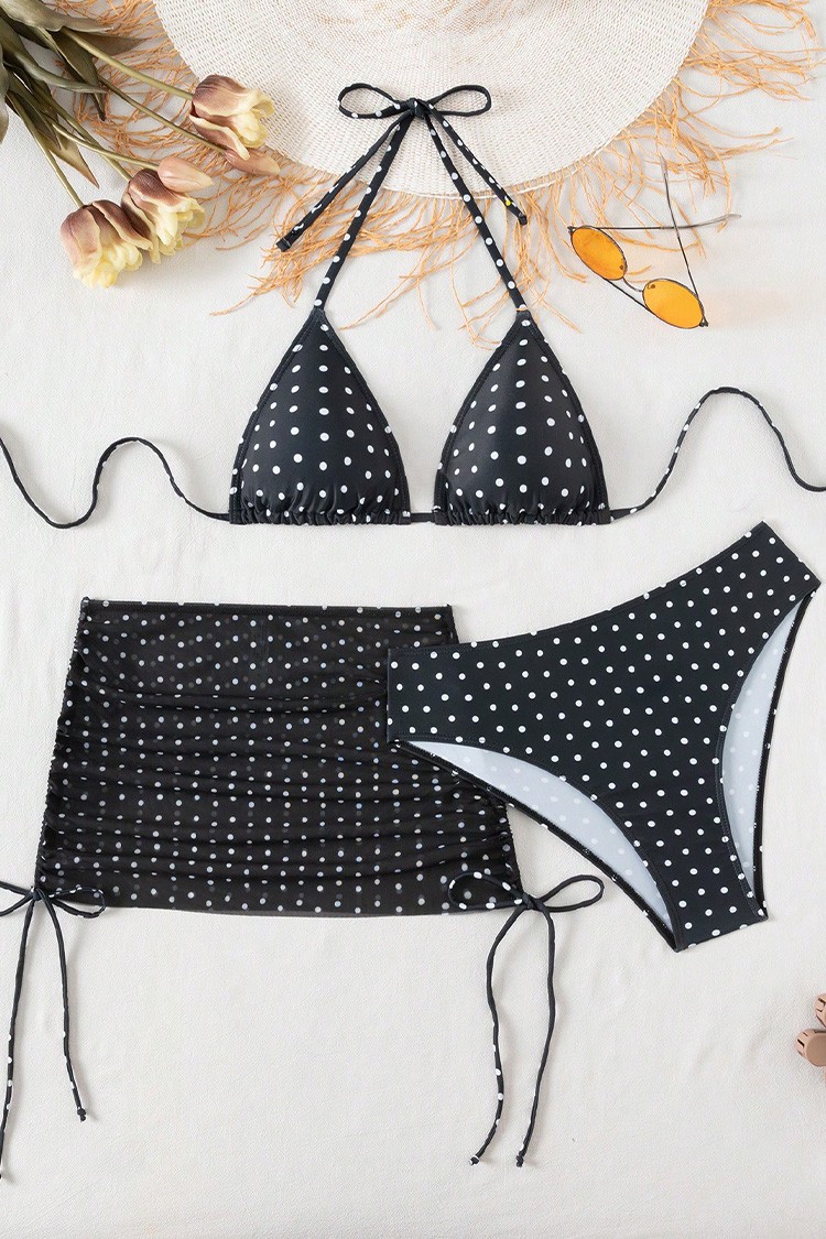 - Divatos strand szett, amely egy kétrészes fürdőruhát és egy szoknyát tartalmaz.