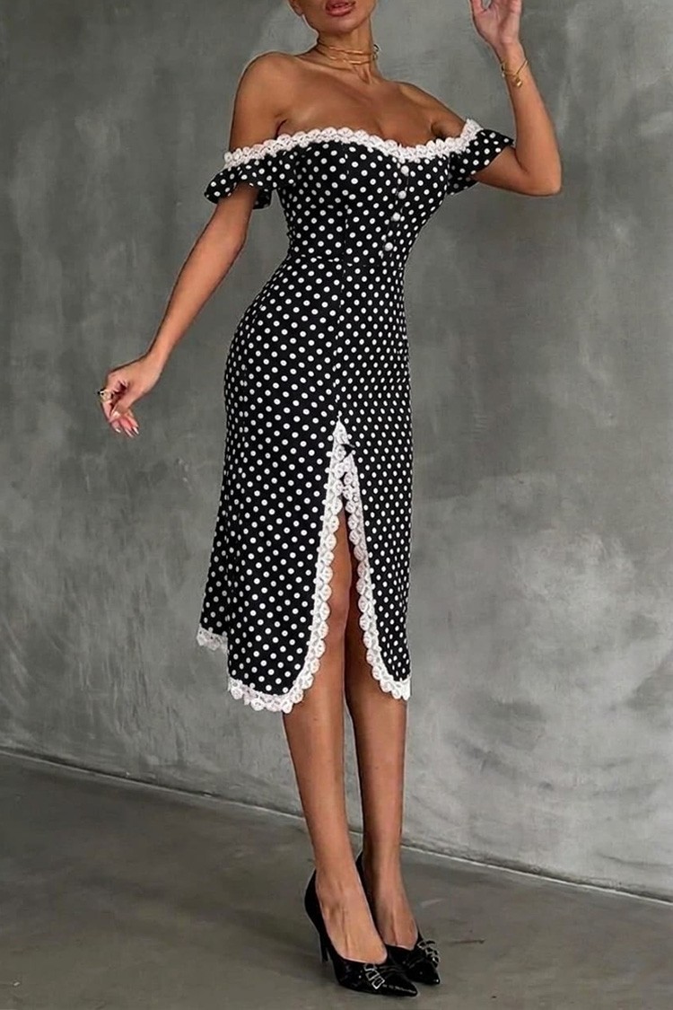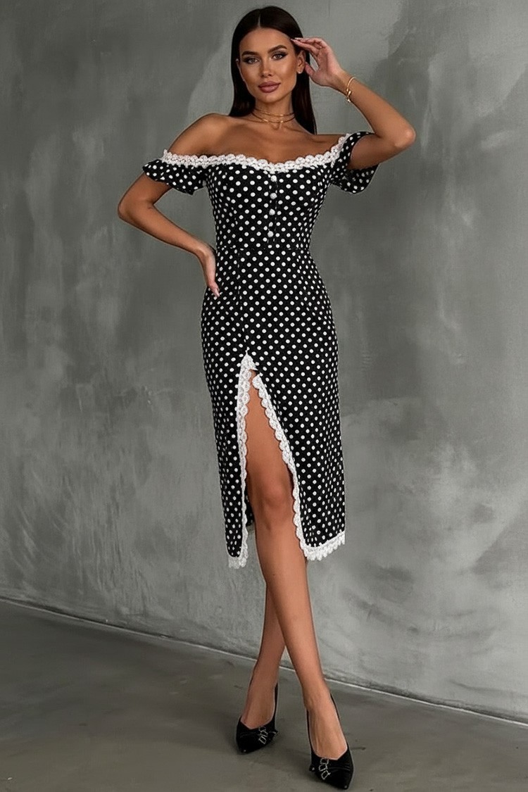 - A modell testhez simuló szabással, ejtett vállal, szexi hasítékkal és pöttyös mintával rendelkezik.
