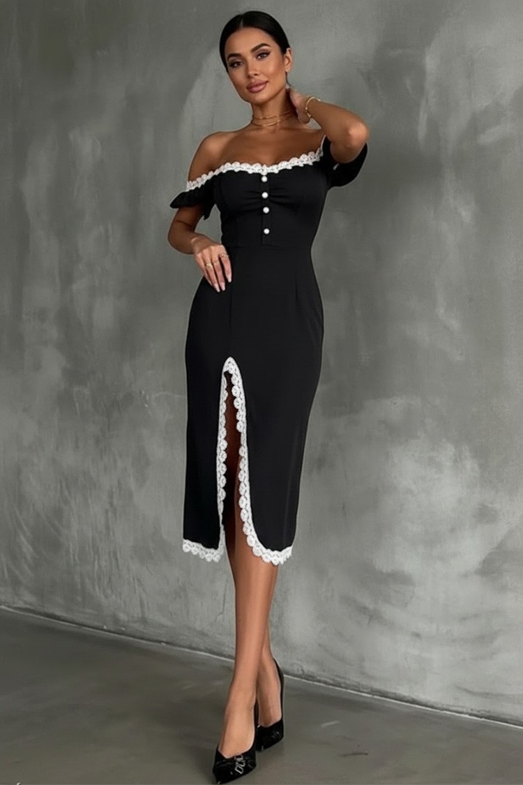 - A modell testhez simuló szabással, ejtett vállal, szexi hasítékkal fekete színben.