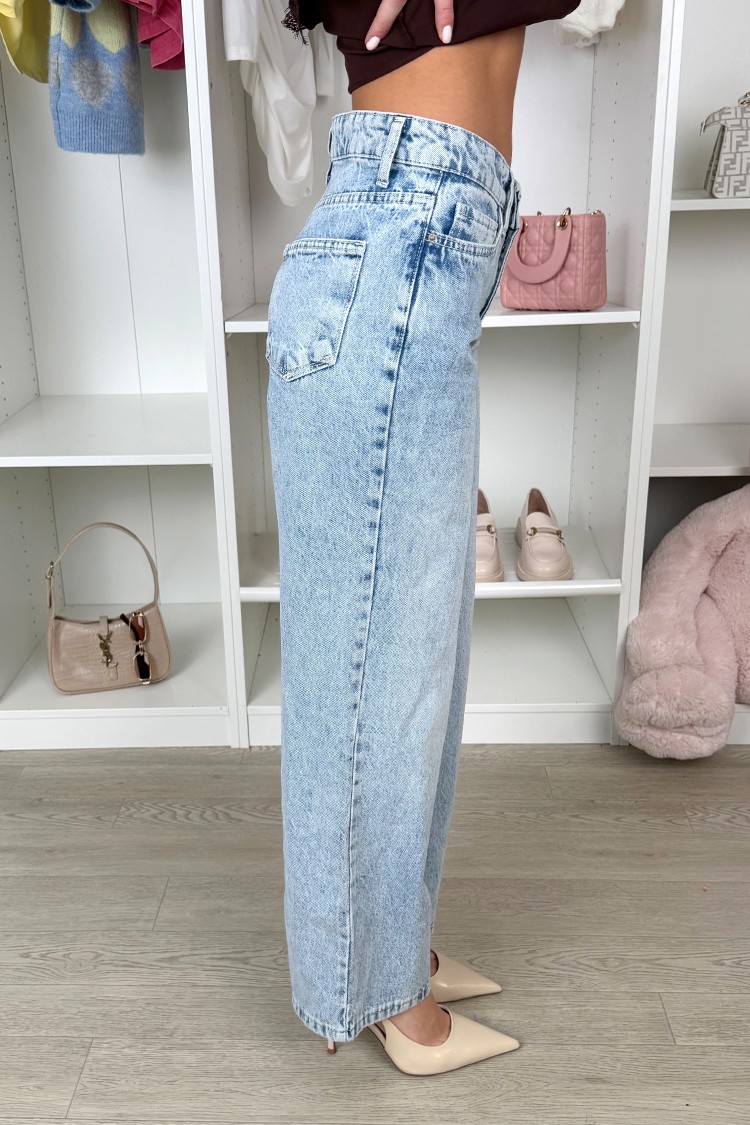 - A modell közepesen mgagas derekú, bő szabású, zsebes, vonzó világoskék szinű.