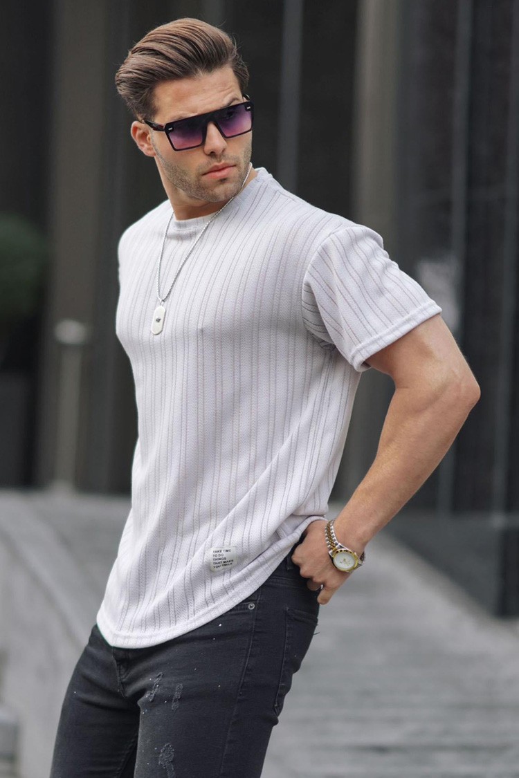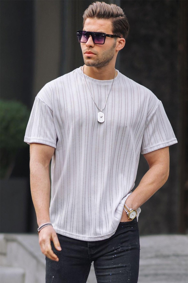 - Férfi kerek nyakú póló, amely alkalmas kiegészítője lehet mindennapi öltözéknek vagy sportoláshoz.