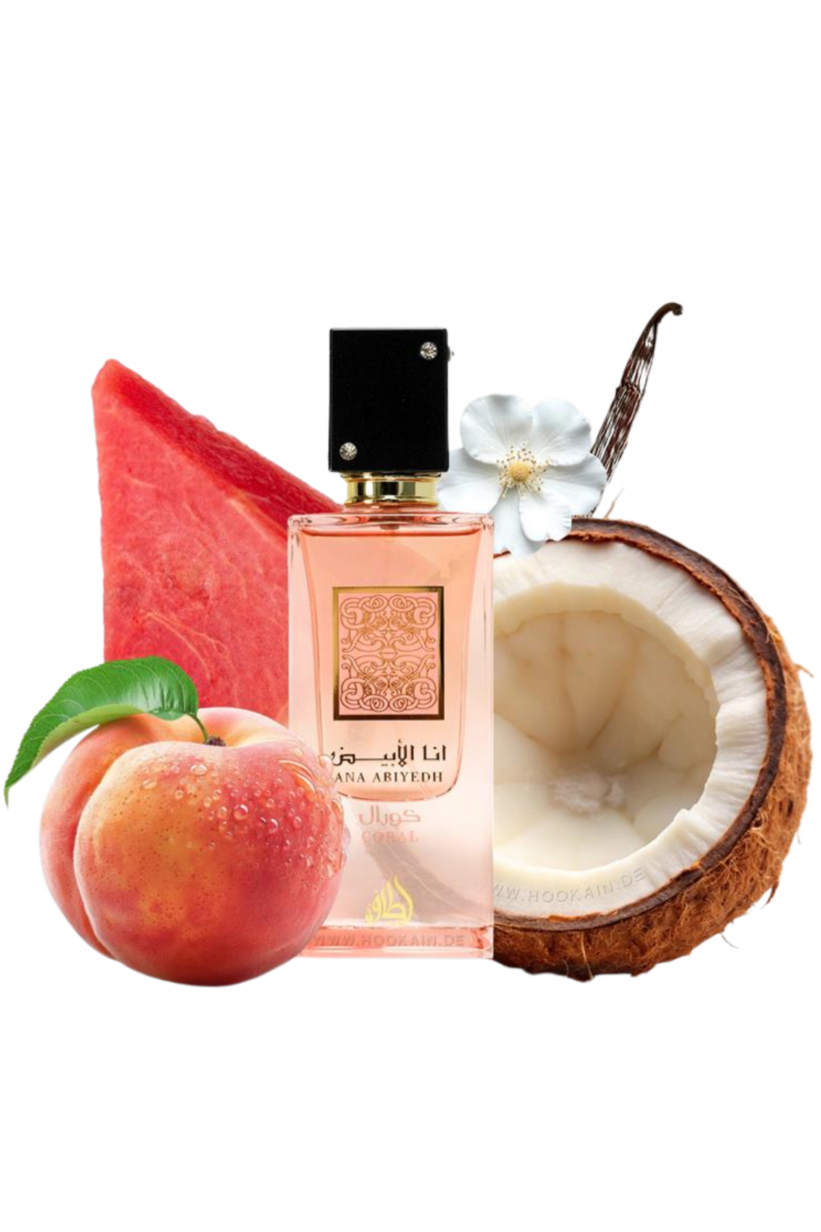 Lattafa Ana Abiyedh Coral: Napos és csábító illat gyümölcsös frissességgel, krémes kókuszdióval és meleg, körülölelő alapjegyekkel.